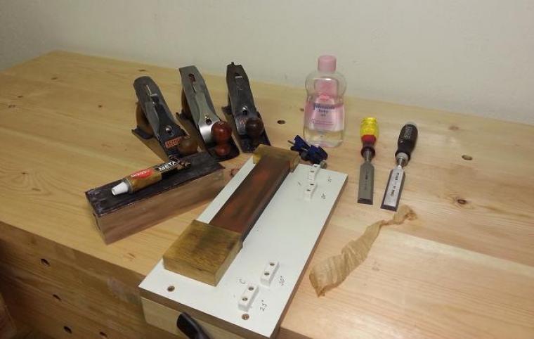 This will be very much aimed at a beginner, for someone who is having problems or for those unsure on what system to use rather than someone who is already happy and settled with their system. To summarise briefly, every sharpening medium that is available today be that sandpaper or ceramic stone works and works well. Mastering any sharpening process be that freehand, with a guide or with powered wheel will only be a matter of practice and what you feel comfortable with. I have chosen my prefered medium which is the oilstone and in this case the Norton India combination stone in 8" x 2" size with a "fine" and "coarse" face and yes it works just fine on A2 steel. Some of the advantages of this system are that it is good value (a Norton India is £33.00/$22.00 delivered to your door), it's does not hollow or wear quickly and it can be used in cold conditions with no risk of freezing. I will demonstrate both freehand honing and with a guide, grinding using the coarse side of the stone, how to sharpen a chisel and a plane iron. I personally freehand hone on finer stones and grind with a powered grinder, but I felt it important to show just what can be done with a very humble system and I will be using tools sharpened in this way on further articles. In addition to the stone you will need a stropping block (if you want to have one like mine I have one extra I can give away, drop a comment in the comments section and I will send you one, if more than one asks I will pick from a hat), honing oil (I find baby oil great but Norton make their own honing oil should you feel the need), a cheap side clamping honing guide, a simple base to locate the stone and some stropping compound (I have used autosol but something like chromium oxide would be just fine). You will spend in total around £50.00 and you might be surprised just how long this system lasts before you want to "upgrade"
